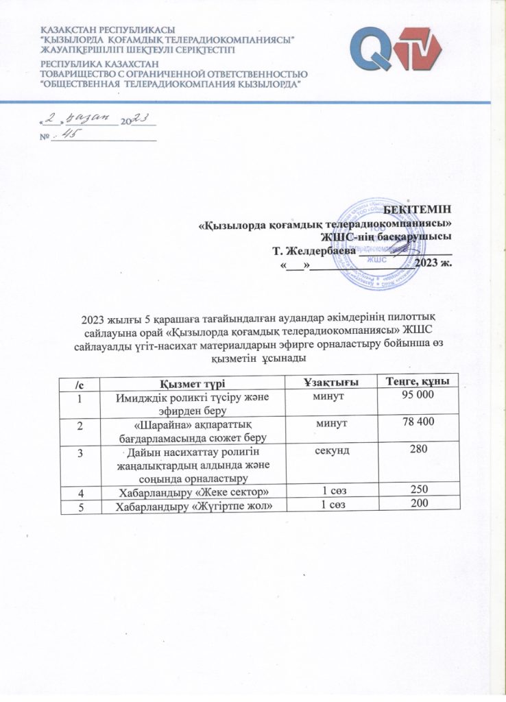 2023 жылғы 5 қарашаға тағайындалған аудандар әкімдерінің пилоттық сайлауына орай «Қызылорда қоғамдық телерадиокомпаниясы» ЖШС сайлауалды үгіт-насихат материалдарын эфирге орналастыру бойынша өз қызметін ұсынады.